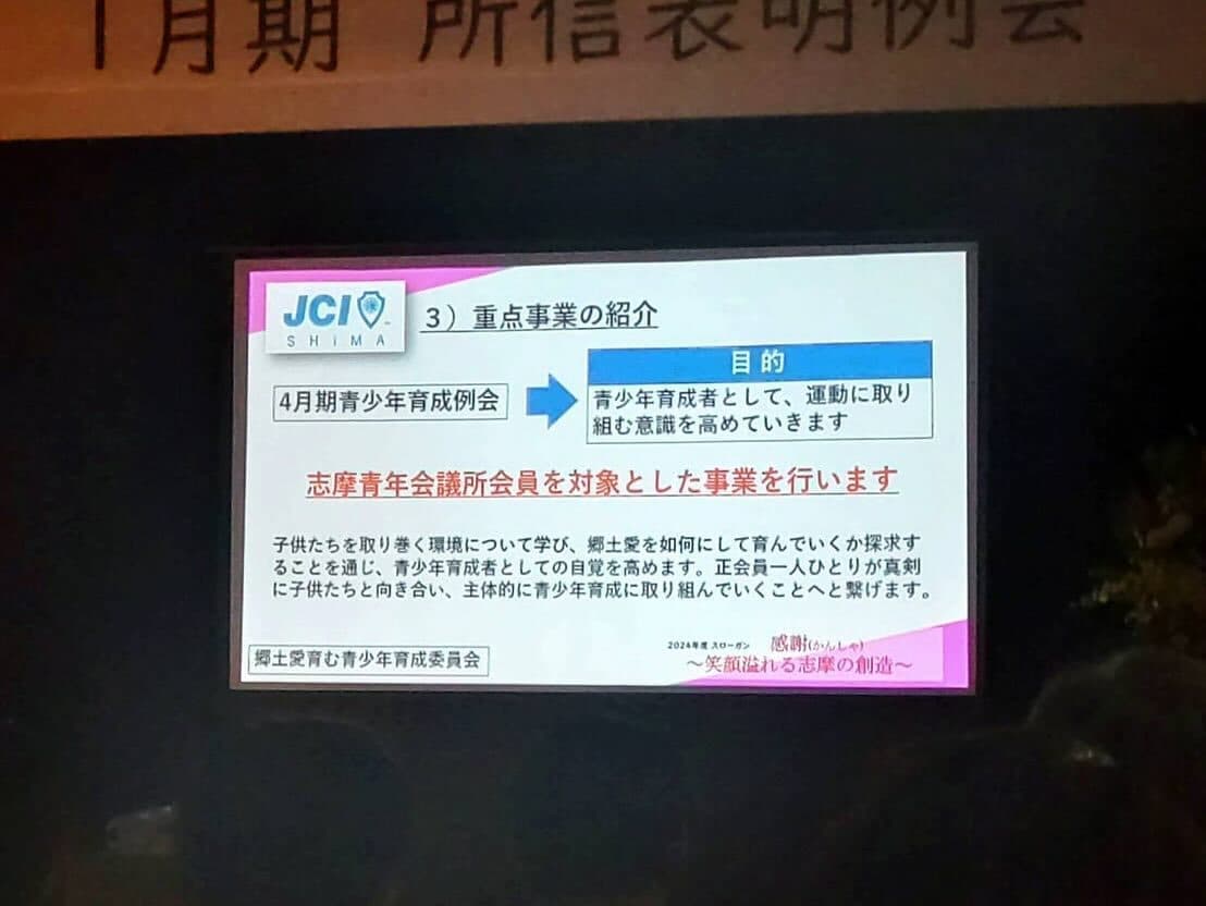また6つの委員会の委員長の所信についても力強い所信表明でした。我々(一社)郡上青年会議所は1月13日(土)に1月定時総会、例会を開催し(一社)志摩青年会議所にもご参加いただく予定となっております。