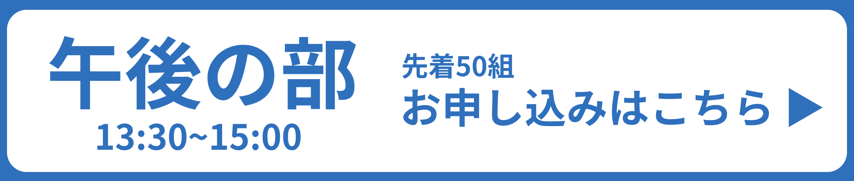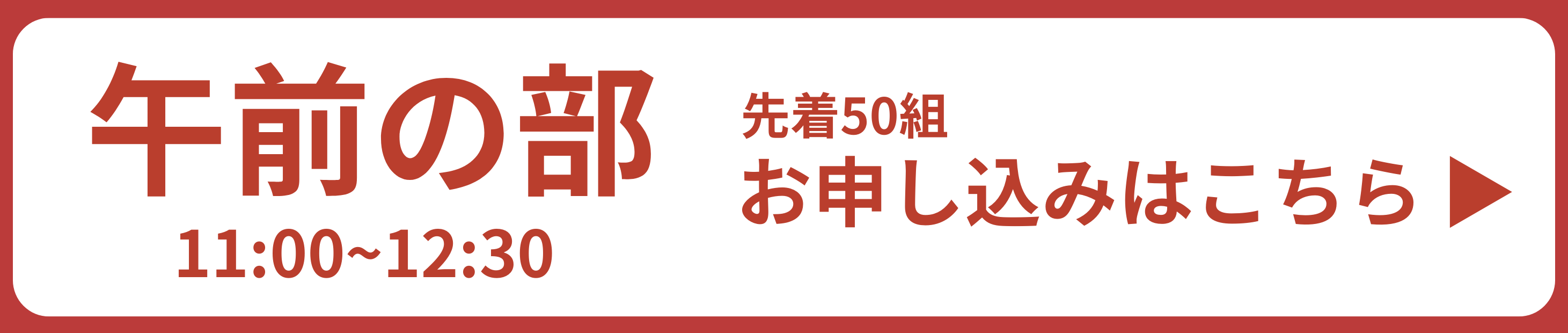 - ・午前の部・午後の部ともに、先着各50組(合計100組)とさせていただいております。先着順となりますので、エントリー後に定員を超えた場合は、参加をキャンセルさせていただく場合がございます。その際は、お電話にてご連絡させていただきますので、あらかじめご了承の上お申し込みください。